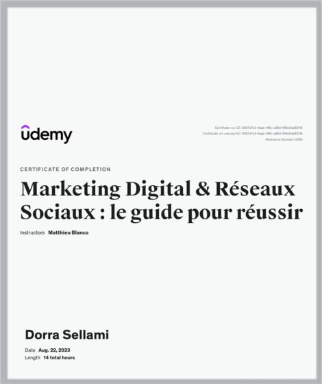 Dank dieser Zertifizierung bin ich nun in der Lage, soziale Medien als leistungsstarkes Instrument zu nutzen, um die Online-Präsenz und den Einfluss einer Marke oder eines Projekts zu steigern.