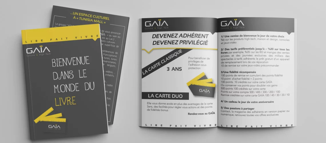 Komplettes Kommunikations- und Designprojekt für GAIA, ein kulturelles Zentrum und Verlagshaus. Entwicklung einer einheitlichen visuellen Identität, Gestaltung von Werbematerialien und Organisation zahlreicher kultureller Veranstaltungen.